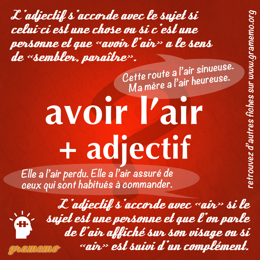 Exemples : Sa sœur a l’air heureuse maintenant. Marie a l’air confiante.