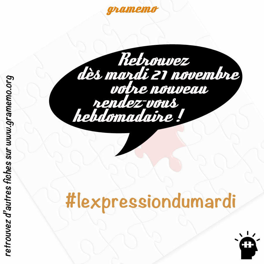 Afin d’enrichir encore la variété des ressources que je mets à la disposition des lecteurs de Gramemo, j’ai décidé d’ajouter une publication hebdomadaire (en plus de celle du jeudi) pour une durée d’une année (minimum). Je vais à partir de la semaine prochaine publier chaque mardi une fiche qui vous présentera en quelques mots une expression française et sa signification. Bienvenue dans #lexpressiondumardi ! (Vous comprenez probablement mieux maintenant de quoi je parlais la semaine dernière à la fin de cet article.)