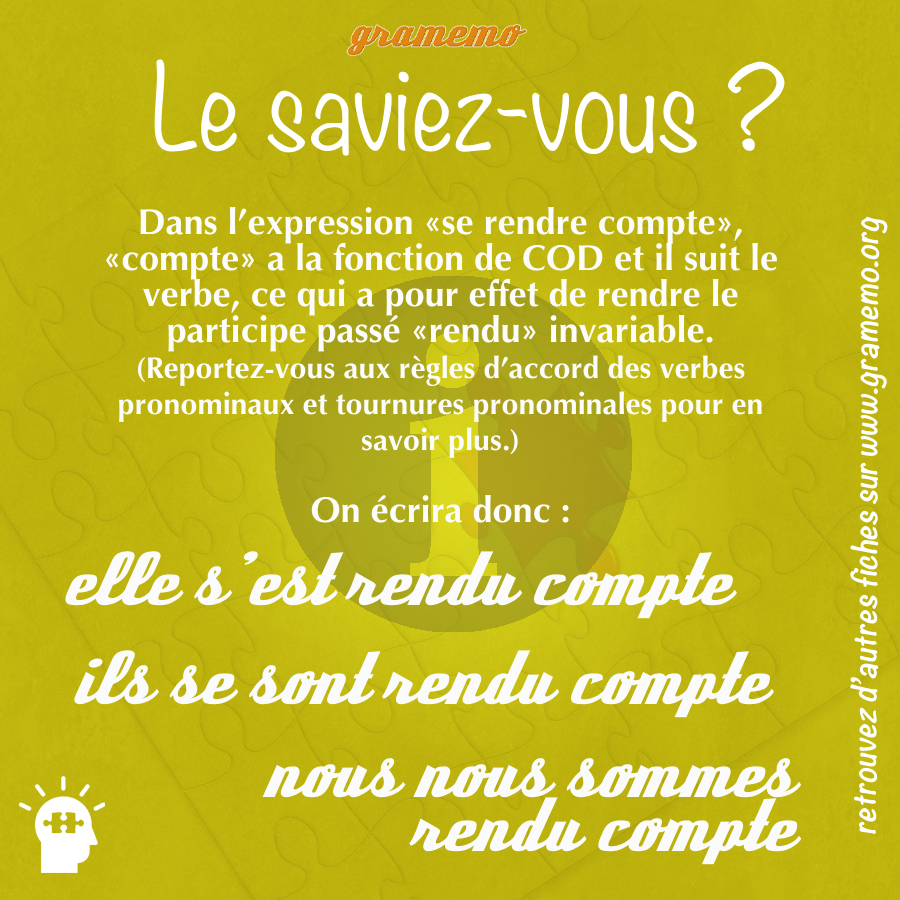 Exemples : Ils se sont rendu compte qu’ils auraient probablement du retard. Elle s’est rendu compte de son erreur.