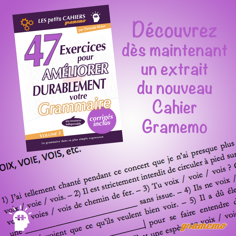 Cette semaine, point de nouvel article sur la grammaire, mais un petit cadeau pour vous, fidèles lecteurs. Je vous propose en effet aujourd’hui de découvrir un exercice extrait du nouveau cahier d’exercices Gramemo, à paraître dans les prochaines semaines : 47 exercices pour améliorer durablement votre grammaire.