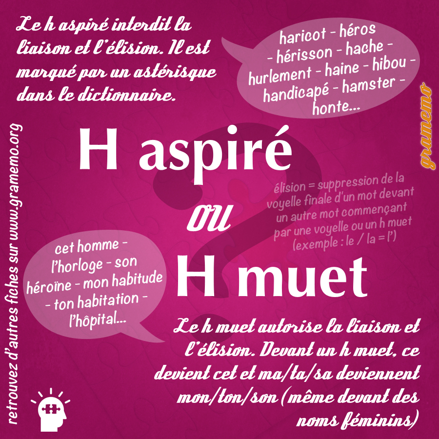 Il est important de savoir si la lettre h placée au début d’un mot est un h muet ou un h aspiré afin de bien prononcer ce mot et ceux qui peuvent le précéder. Pour savoir quel mot commence par un h muet ou aspiré, vous pouvez utiliser cette petite astuce : si le mot peut être précédé de « le » ou « la », il s’agit d’un h aspiré, s’il est précédé de « l' », le h est muet.