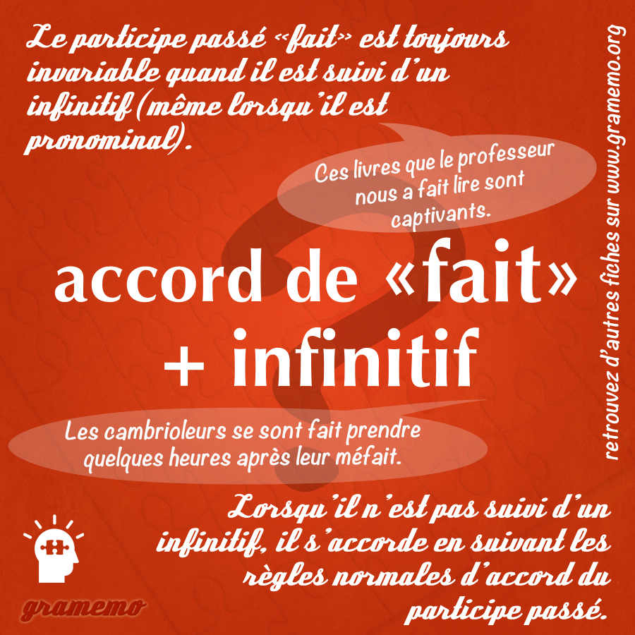 Attention : Lorsqu’il n’est pas suivi d’un infinitif, « fait » s’accorde en suivant les règles normales d’accord du participe passé (que vous pouvez lire ici).