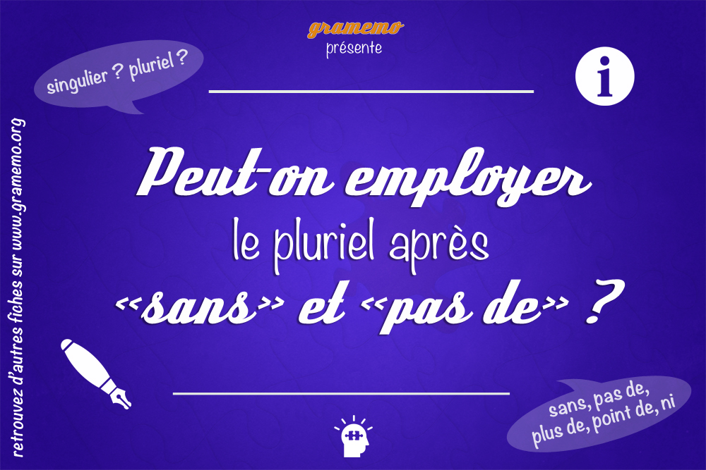 Exemples : un parcours sans risque/risques, être sans nouvelle/nouvelles de quelqu’un, un couple sans enfant/enfants, un jardin sans fleur/fleurs, une rédaction sans faute/fautes, une personne sans scrupule/scrupules, accuser sans preuve/preuves, sans limite/limites, etc.