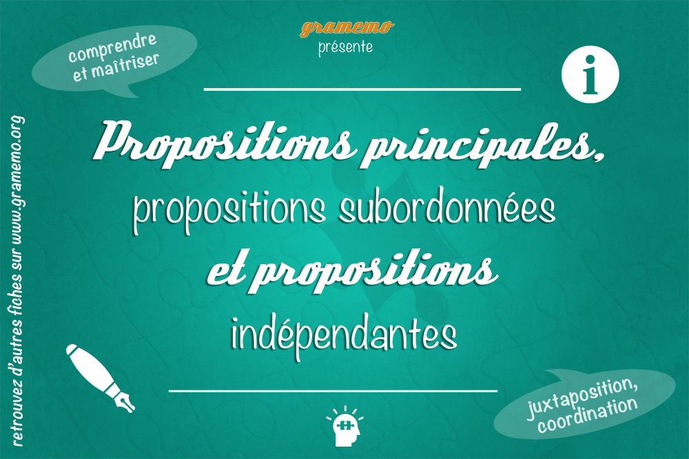 On distingue les propositions indépendantes (qui sont parfois coordonnées ou juxtaposées), les propositions principales, et les propositions subordonnées (ces dernières pouvant elles-mêmes être conjonctives complétives, conjonctives circonstancielles, relatives, interrogatives indirectes, ou même infinitives et participiales).