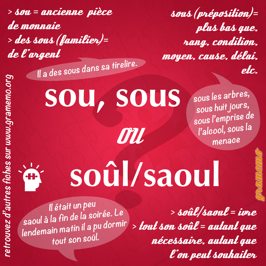 Cet article se propose de passer en revue les homophones sou, soûl, saoul et sous.